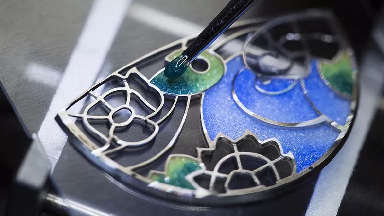 在我看来,珐琅应用在表盘上是最专业的工匠技艺之一。珐琅也有各种具体的技法但是大多数都要求都离不开“高温”的烘托。奇妙之处在于在于整个烧纸的过程。
