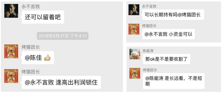 在这个群里,经常会有人问团长,「这个可以买了吗?」「团长那个可以买了吗?」「团长,这个币什么时候上车/下车?」绝大部分情况下,烤猫团长不会告诉这个人如何操作,而是说一些很冠冕堂话、不知所云的话,比如下图