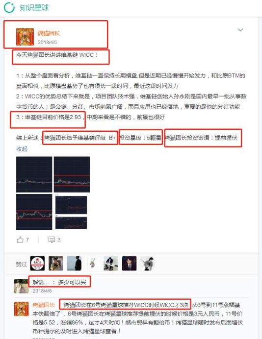 烤猫团长主推体育竞彩主题的 SOC 和 WICC,这两个币种从历史币价来看,投资者进来一个坑一个,但是烤猫团长就靠着准确地预测 SOC 和 WICC 币价走势而吸引不少粉丝。他的知识星球中有 800 多位粉丝,每人都支付了 199 元人民币,约人民币 16 万元。