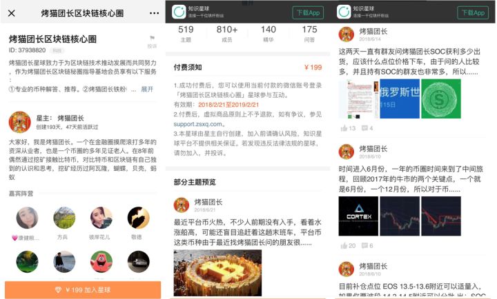 群主名叫烤猫团长,乍一看还以为是那个消失在江湖的烤猫又重出江湖,但是他那个财神爷的头像让人瞬间出戏。烤猫团长在人数开始增加的时候就开始宣传自己的知识星球,只需要 199 元,就可以加入这个他每天都会向小部分人分享投资诀窍的私密社群。