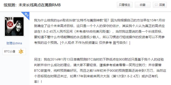 在国内众多媒体,对比特币的布道过程中,这个小生态虽然没有走出什么大人物,但也诞生了炒币名人万八教主——弦理论 china。他曾因在 2013 年成功预测比特币在 2015 年的最低点和 2016 年的最高点而被人们称为万八教主,他的理论网传被江卓尔盛赞「点位这方面,比我更接近上帝」。