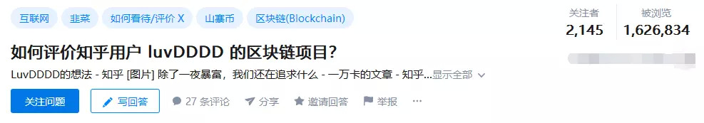 在知乎上,一个匿名提问「如何评价知乎用户 luvDDDD 的区块链项目?」成功地吸引了整个知乎社群对于大 V 名人喊单事情的关注,参与者不仅有让知乎上喊单的十几位大 V,甚至也吸引了知乎创始人张亮的注意。