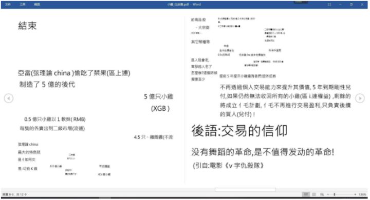 整个白皮书的内容风格如上所示,全白皮书没有技术说明、没有投资人介绍、没有完整的 Token 分配方案,甚至在 Token 增值模型部分,在开头部分直接说到:「亞當 (弦理論 china ) 偷吃了禁果 (區上連) 制造了 5 億的後代」。
