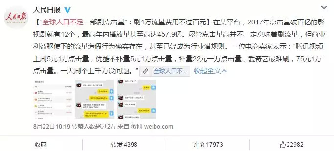 8月22日,《人民日报》对此发出质疑,“尽管点击量高并不一定意味着刷流量,但商业利益驱使下的流量造假行为确实存在,甚至已经成为行业潜规则”。甚至刷播放量成为了一条灰色产业链,明码标价,大部分视频平台5元就能刷1万点击量,一天能刷个上千万流量。