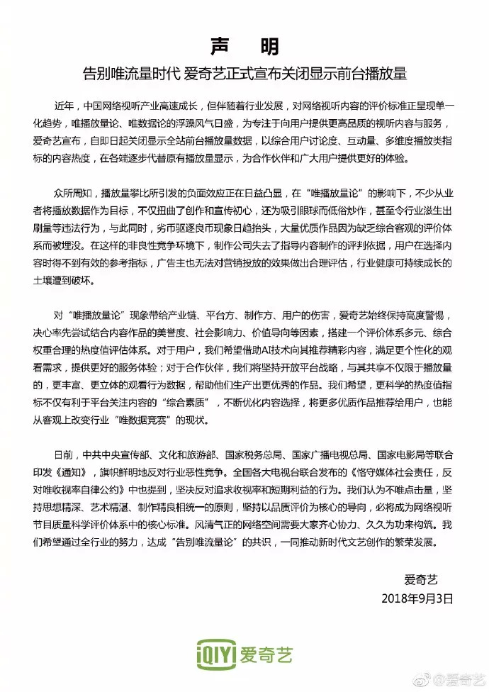 声明称“播放量攀比所引发的负面效应正在日益凸显,在‘唯播放量论’的影响下,不少从业者将播放数据作为目标,不仅扭曲了创作和宣传初心,还为吸引眼球而低俗炒作,甚至令行业滋生出刷量等违法行为”,爱奇艺决定“自即日起关闭显示全站前台播放量数据,以综合用户讨论度、互动量、多维度播放类指标的内容热度,在各端逐步代替原有播放量显示,为合作伙伴和广大用户提供更好的体验。”