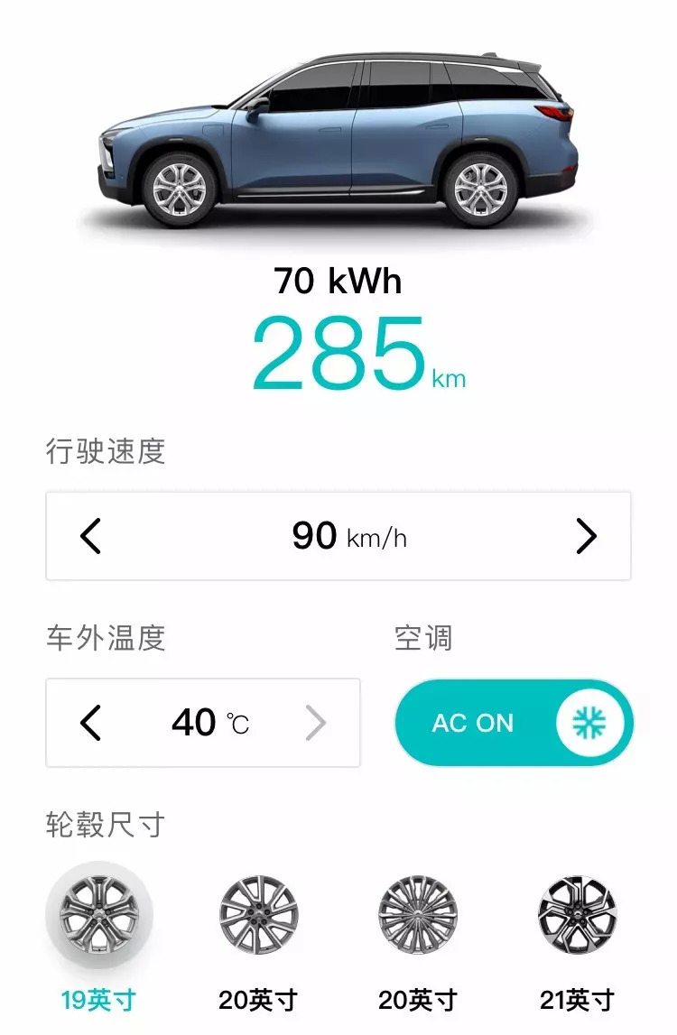 在这里需要说明的一点是,在蔚来APP爱车菜单工具与服务选项中有一个ES8里程计算器选项,选择行驶速度90km/h,车外温度40℃,空调打开,轮毂尺寸19英寸,其显示等速续航里程为285公里。