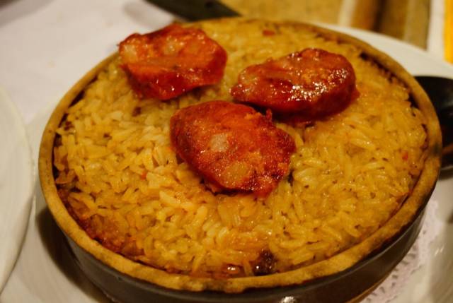 每份焗鸭饭上铺设三块葡式香肠;撕成一缕缕的鸭肉和香米铺设在一起,一层层的分布在米粒中;米粒各个晶莹剔透呈现出琥珀色的光泽,鸭肉的香味渗入饭粒,即使不用菜,干食也足够美味。
