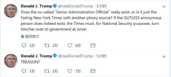 在推特上,特朗普给作者和《纽约时报》提出了这种做法是否“叛国”的问题。但或许正如这位白宫高官所说,他们最终的忠诚和责任要献给国家,而特朗普不等于美国。