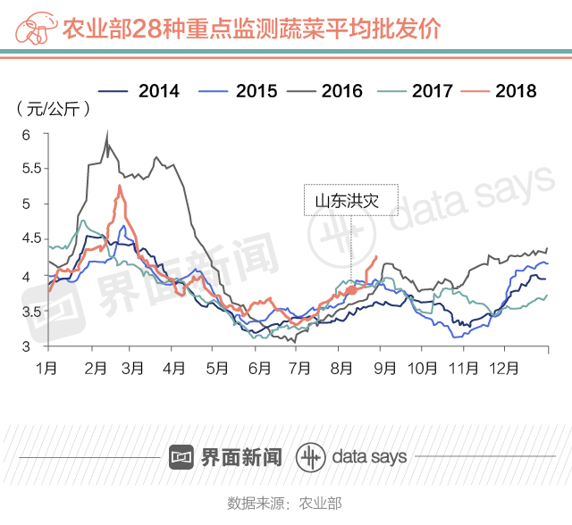 对比近五年的蔬菜价格,受高温多雨天气影响,蔬菜价格都会在7月至9月迎来季节性上涨。山东受灾后,今年8月下旬以来的蔬菜价格快速上涨,大幅超过近年同期水平。