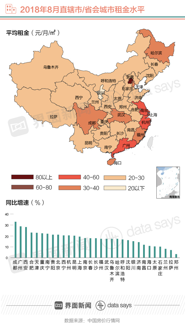 从租金增速来看,上涨最快的城市是成都,8月同比增速达到33%;广州、西安的同比增速均超过28%。