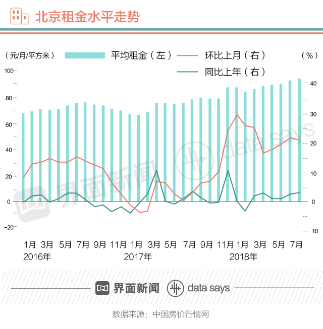 最近,关于房租上涨的话题也很热。中国房价行情网数据显示,2018年8月,全国租金水平最高的城市是北京,平均每平米94.87元;其次是上海,平均每平米75.34元。