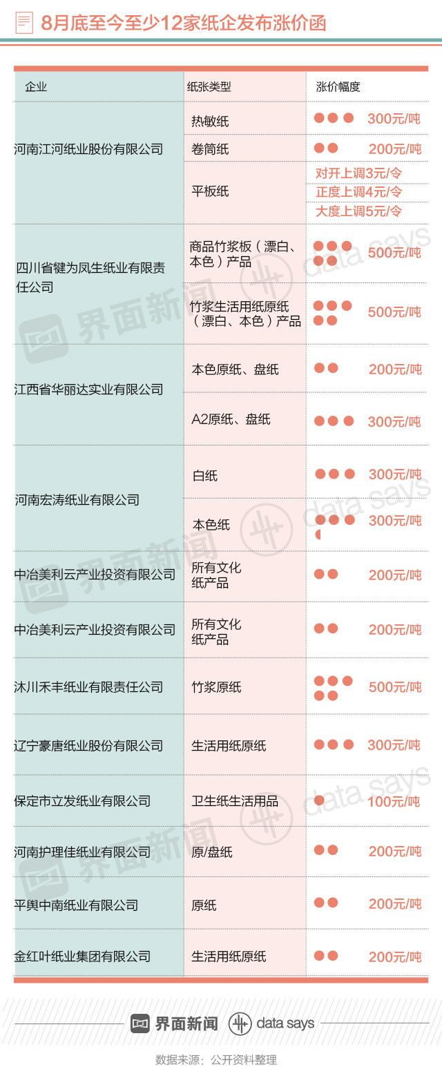 据界面数据(公众号ID:tuli_shuju)不完全统计,2018年,中国纸企已经进行了数轮涨价;8月底至今,已有至少12家纸企发布涨价函,从生活用纸到白纸,几乎所有纸品都在涨价。