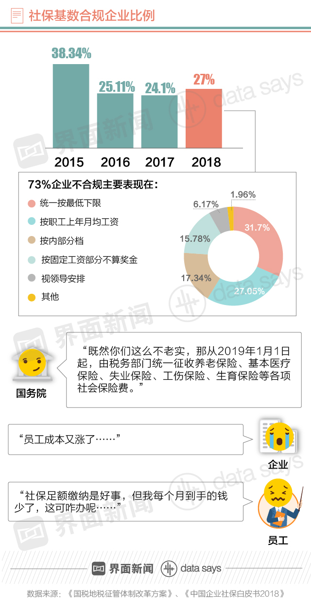 这两项政策,前者减轻了低收入者的税负,提高了可支配收入;后者在提高员工社保水平的同时,员工每月到手工资也会明显减少,企业的用工成本也被相应抬高——2018年,全国只有不到三成的企业是按照国家要求为员工缴纳社保的。