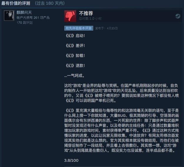 随后该游戏制作人面对差评,居然回应「《幻》不是一个取悦所有玩家的游戏」,否认游戏的不足,直接与玩家宣战。