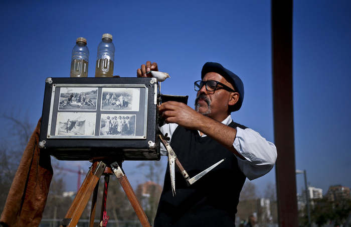 1. 智利圣地亚哥,摄影师Luis Maldonado把木马道具扛到广场的集市上,在那儿他会用自己的老式木盒相机给上门的顾客拍肖像。边走他边笑着说:“用木盒相机拍照很美,对我来说,它像是一种‘乡愁’,已经融入到我的血液之中了。我知道人要生活,但人依然可以选择做自己喜欢的……”