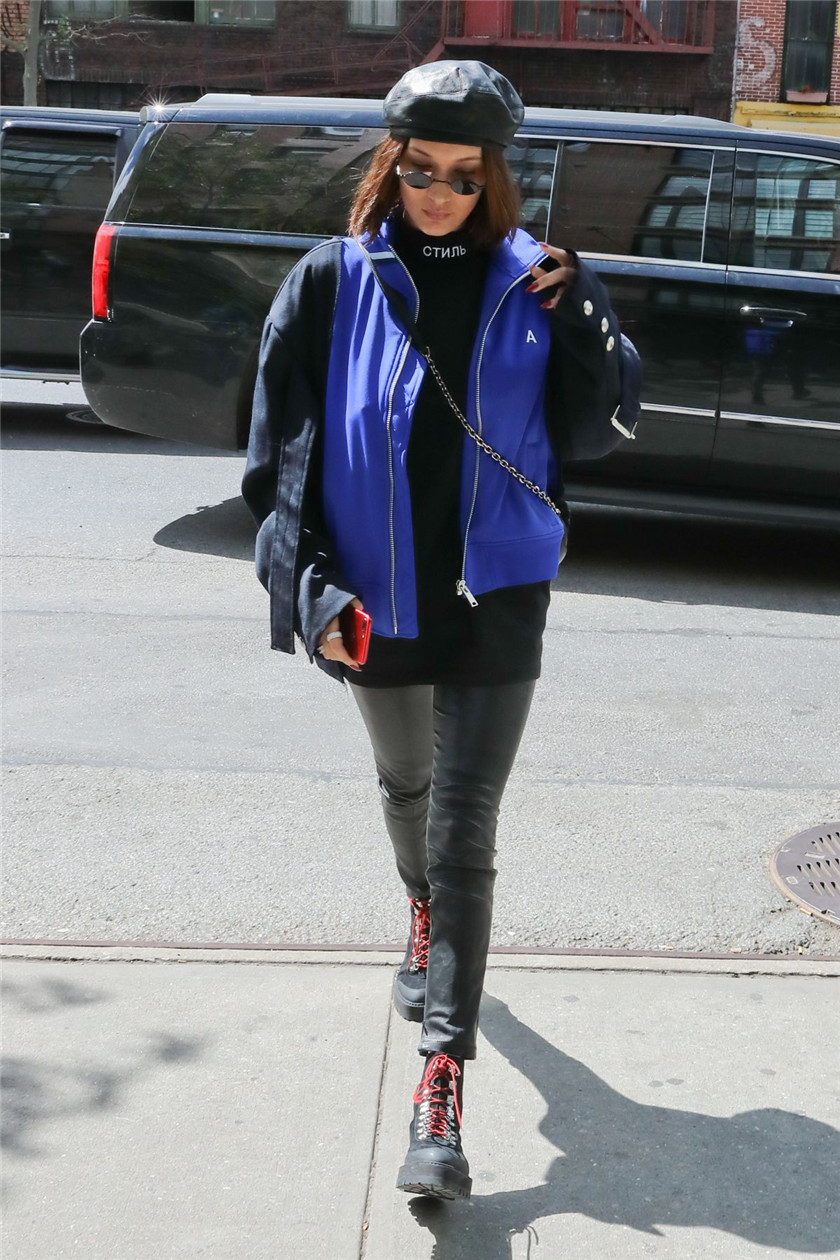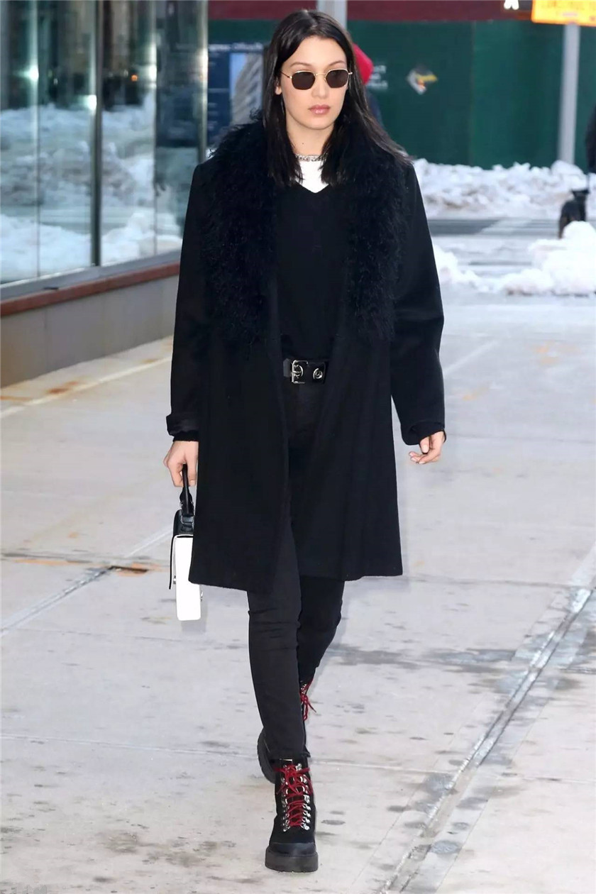 从颜色上来看,一般登山靴都会采用军绿、黑等深色的设计,利用这一点,我们可以选择同色系的紧身裤来搭配。比如说用黑色铅笔裤搭配黑色的登山靴的时候,颜色的融合一定程度上会使原本被遮盖的部分进行延伸,从而使腿看起来更加修长。