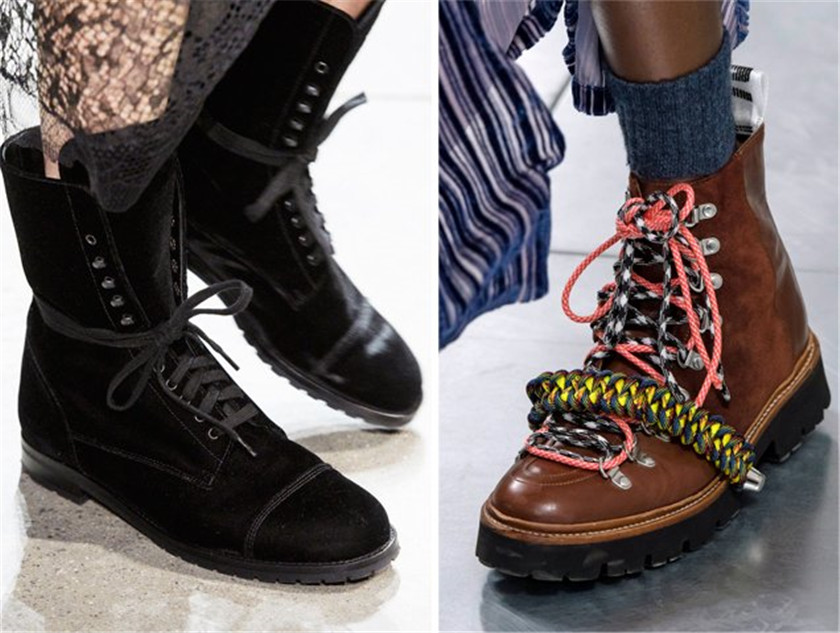 伴随而来的就是即将成为今年秋天流行趋势之一的鞋履类别——登山靴。从表面上来看,女性登山靴与潮人们爱不释手的马丁靴并无太大差异,但实际上二者却有很大的不同。常见的专业登山靴大多注重于防水、保暖等功能性,外层比较硬,有一些还专门设计了卡具的位置以方便登雪山时安装冰爪。