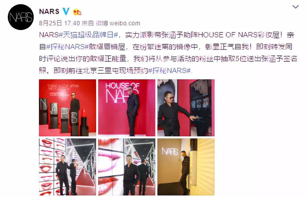8月25日,心有不甘的NARS再战江湖,在北京时尚地标三里屯的专柜活动中,中国银幕的著名硬汉张涵予现身助阵,舆论界本来没啥声音,在各种自导自演推波助澜的组合拳后,开始有人讨论。