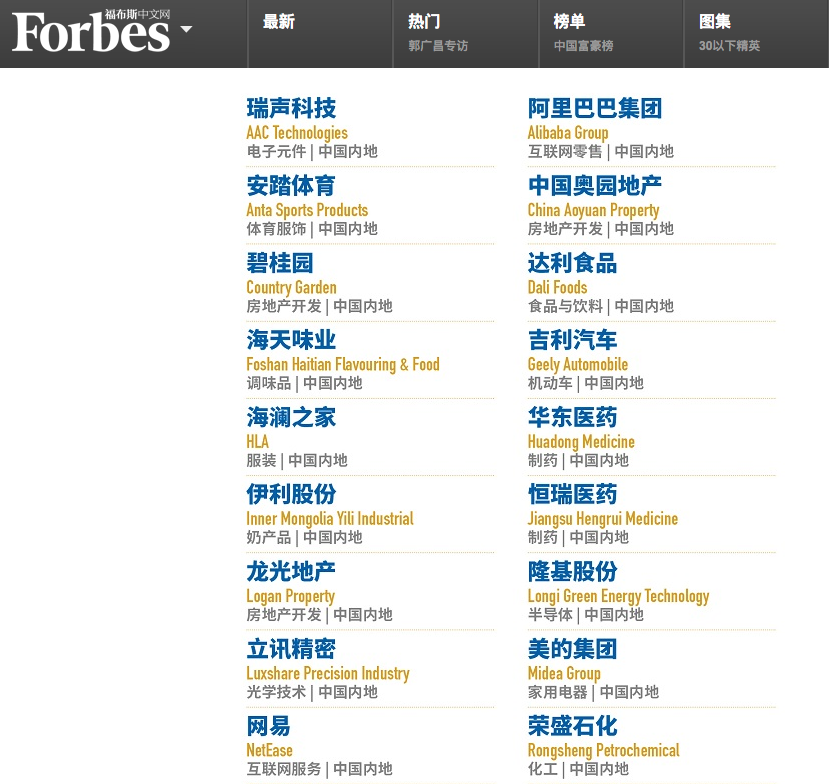 《福布斯》的目标是评出绩效优异的蓝筹企业英雄榜,上榜企业都是本地区的精英。2018年度亚洲最佳上市公司50强上榜公司包括碧桂园、腾讯、阿里巴巴、美的集团、伊利股份等各行业龙头企业。