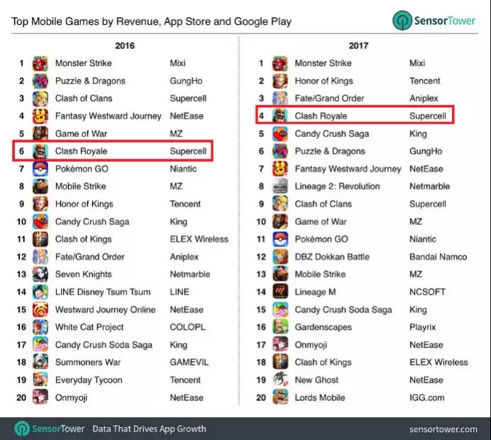根据SensorTower发布的2016和2017年度全球移动游戏畅销榜显示,《皇室战争》自始至终都表现强劲且稳定,已经连续2年挤进了App Store&Google Play畅销榜前十。在2016年,《皇室战争》以App Store年度最佳游戏、全球手游收入TOP10(仅10个月收入)、营收超过10亿美金收官。2017年,《皇室战争》势头依旧强劲,一举拿下了年度综合畅销榜TOP4——排名仅次于《怪物弹珠》、《王者荣耀》和《FGO》。