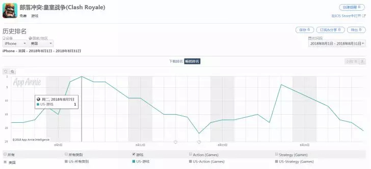 根据AppAnnie的数据,在整个8月,《皇室战争》在美国App Store畅销榜上的排名基本在TOP20以内。值得一提的是,在8月7日,这款游戏的表现尤为亮眼,一举拿下了美国畅销榜冠军。