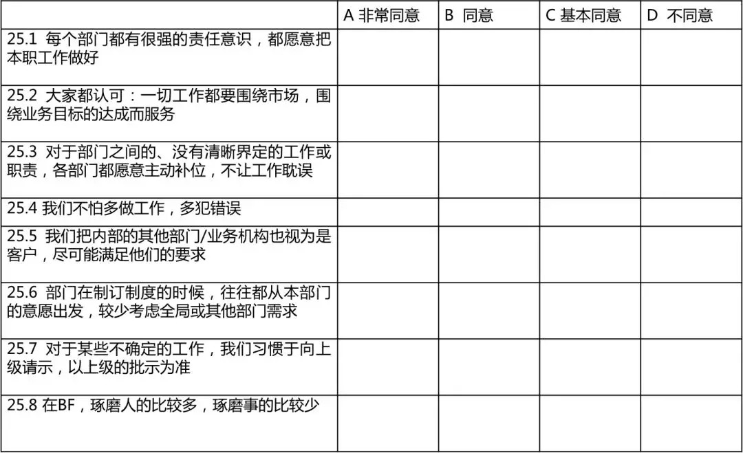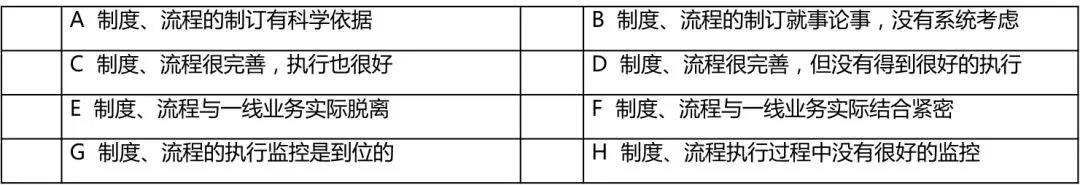 流程及制度:流程制度的可操作性(与市场需求的吻合程度),制度的执行问题,执行过程中的监控问题,非常规业务的工作流程,审批效率,效率