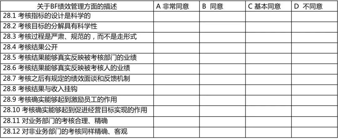 28,以下关于BF绩效管理方面的描述,您是怎么看待的?(每行单选)