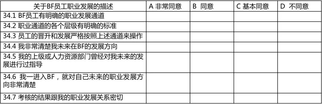 34,以下关于BF员工职业发展的描述,您是怎么看待的?(每行单选)
