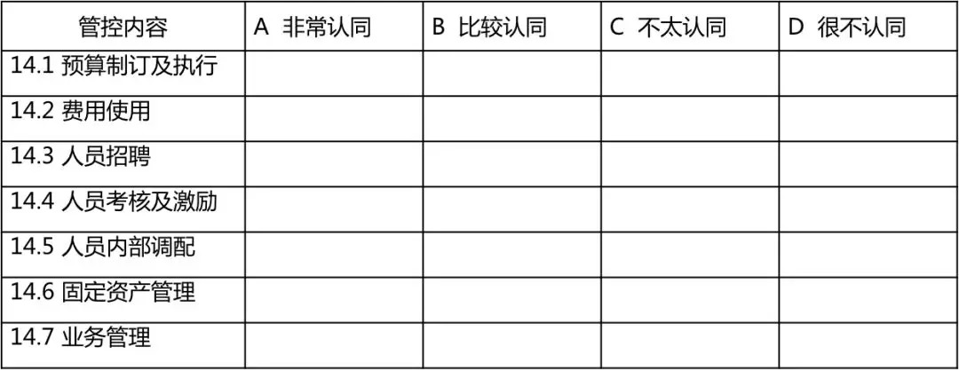 14,您是否认同BF在下列方面对下属机构的管理和控制是规范、严格、有效的?(每行单选)