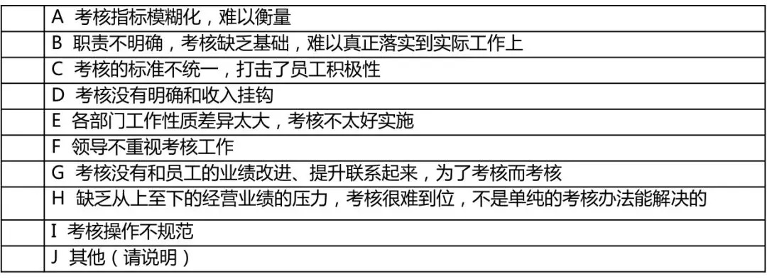 绩效考核:指标设计分解是否科学(跟工作任务的吻合性)、目标值的设定存在鞭打快牛的现象、是否有反馈和沟通的机制、考核过程的严肃性、规范性,考核的公开性,客观性问题