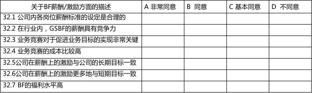 32,以下关于BF的薪酬和激励方面的描述,您是怎么看待的?(每行单选)