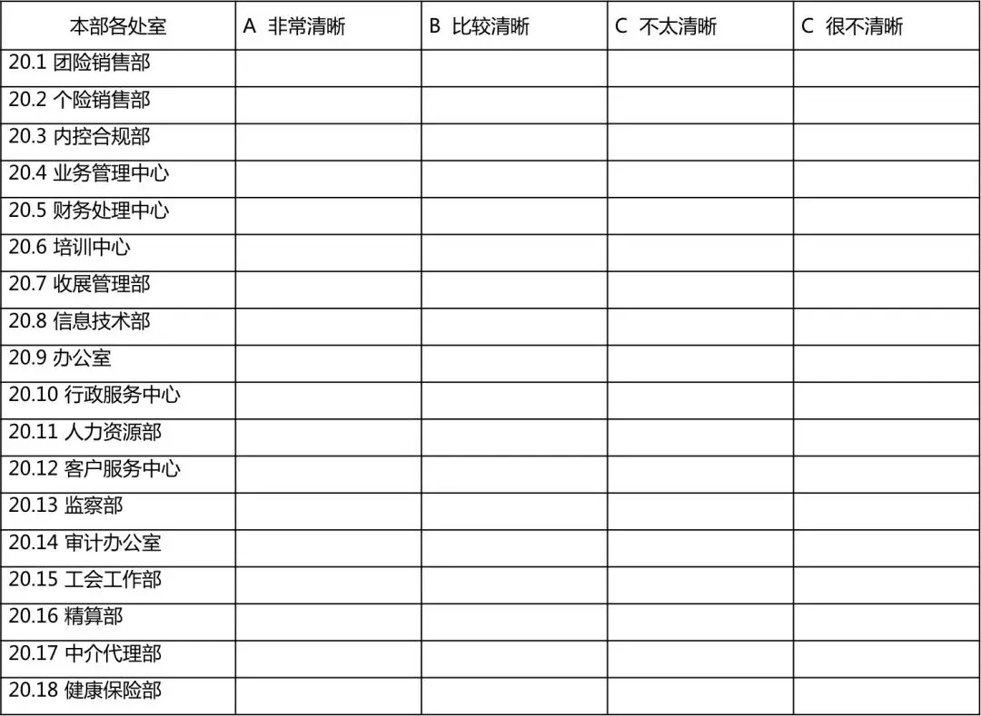 20,您认为BF本部各处室的职责、权限划分是否清晰?(每行单选)