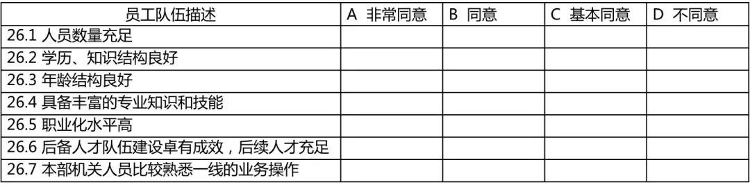 26,您如何看待BF的员工队伍建设情况?(每行单选)