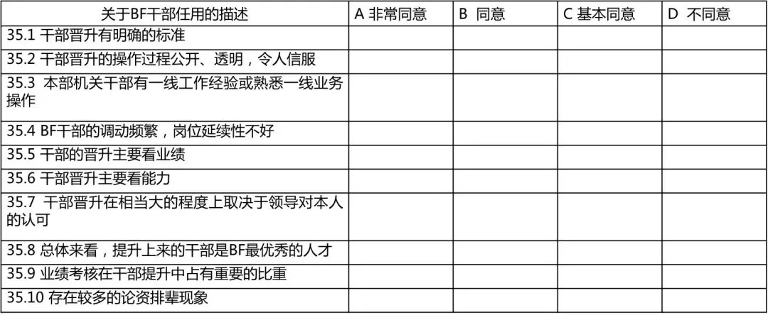 35,以下关于BF干部任用的描述,您是怎么看待的?(每行单选)