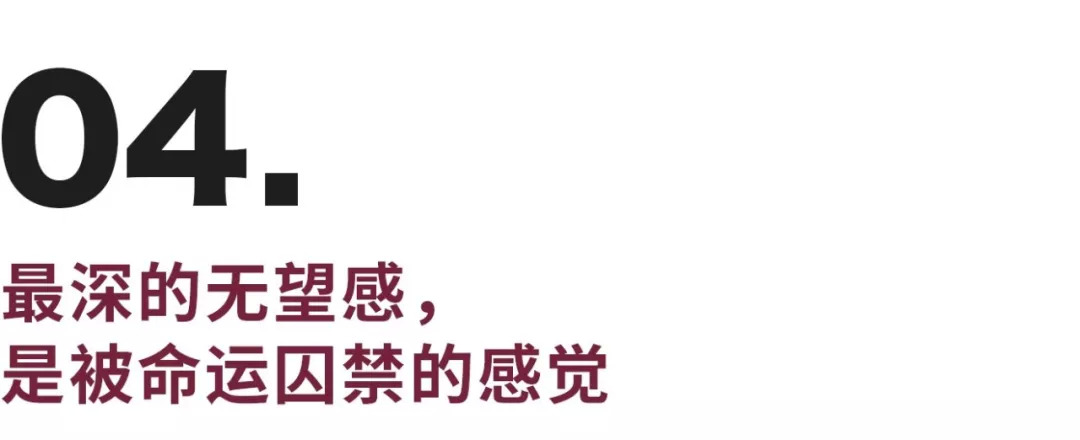 还有很多人,是自己依赖无望感的存在——因为只要保持着完全的无望,人生就可以变得毫不费力了。只有怀有希望的人才会努力挣扎,绝望的人是不需要努力的。甚至,当这种悲剧性的人生,变成了一种“被选中”的命运,自己渺小平凡的一生,也就仿佛有了“特别”的光彩。