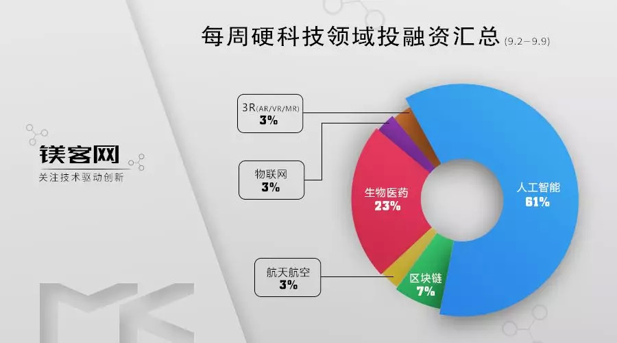 上周硬科技领域投融资事件一共30起,人工智能领域发生18起融资事件,占比61%;生物医药领域发生7起融资事件,占比23%;区块链发生2起融资事件,占比7%;物联网和航空航天以及3R(VR/AR/MR)分别发生1起融资事件,各占比为3%。