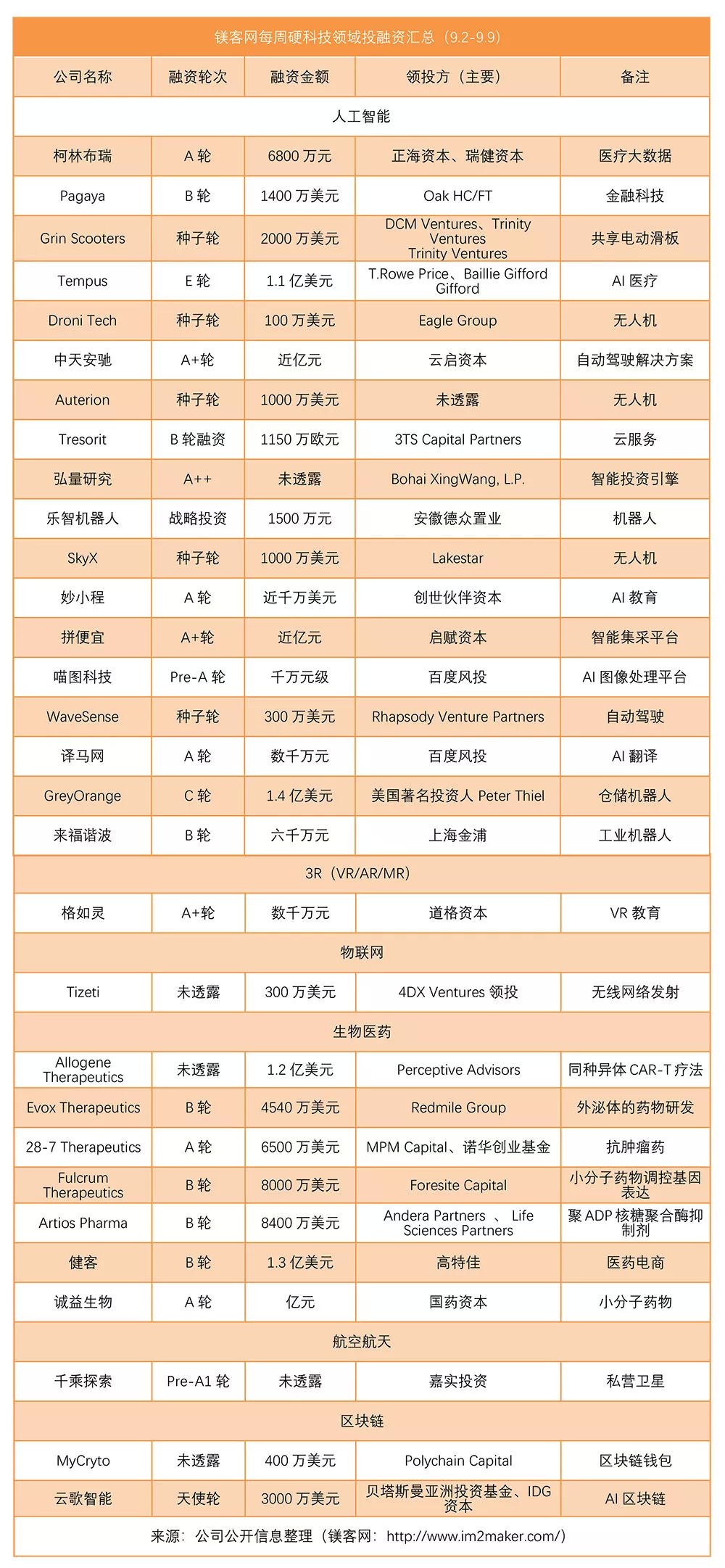 值得注意的是,上周有多起和无人机相关的融资,这些企业的无人机大多都是应用在行业级市场,包括医疗救援、农业等等。另外,专注于VR教育的格如灵也在上周获得了来自道格资本的投资,在K12教育领域,与AI、VR等新技术结合的教程非常受市场欢迎。最后,上周还有一起关于ofo的融资传闻,介于没有最终确定,我们并没有放入表格,不过关于ofo的融资迷局已经成为当下大家颇为关注的热点话题,后续我们也会持续跟进。