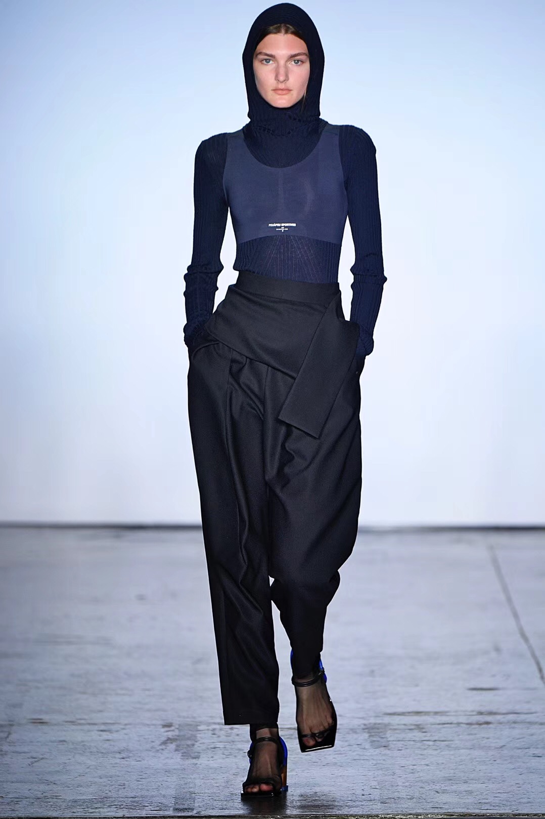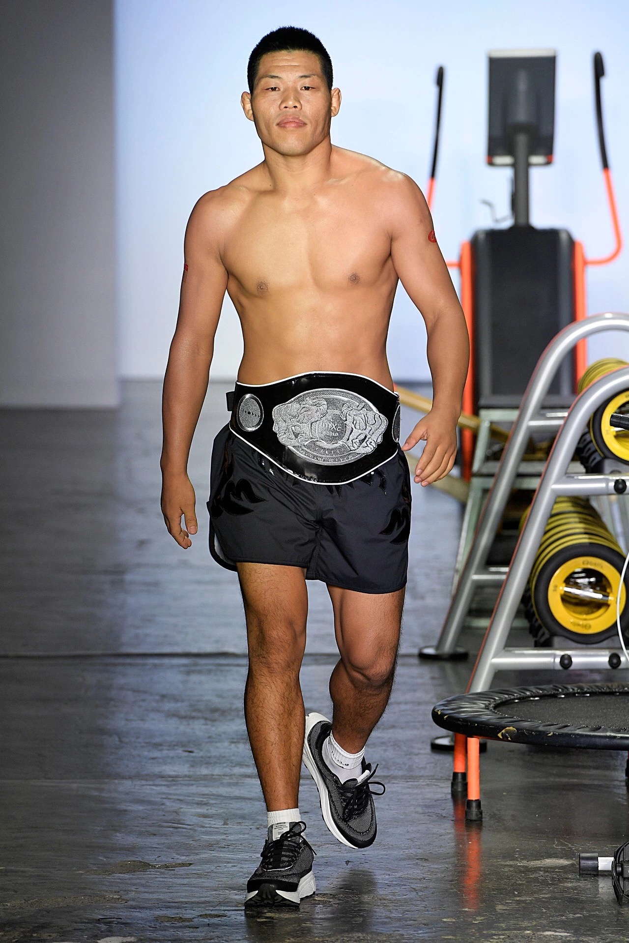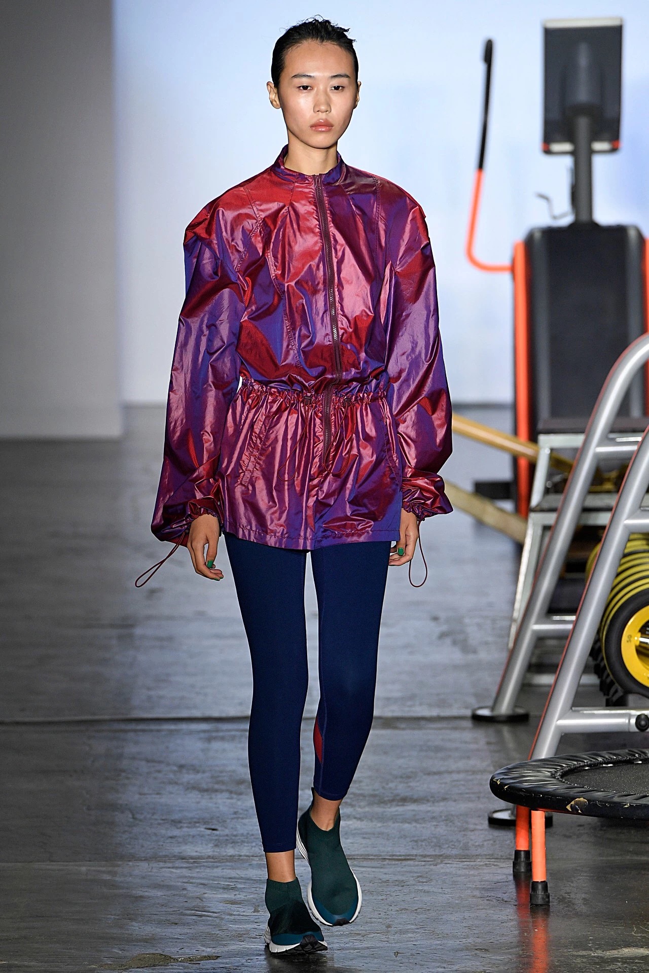 秀场上的运动器械不少都是划船机、蹦床等小众器材,Particle Fever纽约时装周上展示的最新系列也大多与小众运动有关。无论是为翼装飞行运动员设计的翼装、为搏击运动员设计的多功能腰带、还是为越野跑选手设计的贴身运动服,Particle Fever的最新系列都聚焦于服装的功能性和舒适性,因此都采用了超轻、贴身的高科技面料。秀上还出现了两个跨界合作的特别单品,一个是与3M公司合作、填充了最新保暖材料的多边形翼装棉服,一个是与深圳万象天地合作、印有大象图案的拳击腰带。