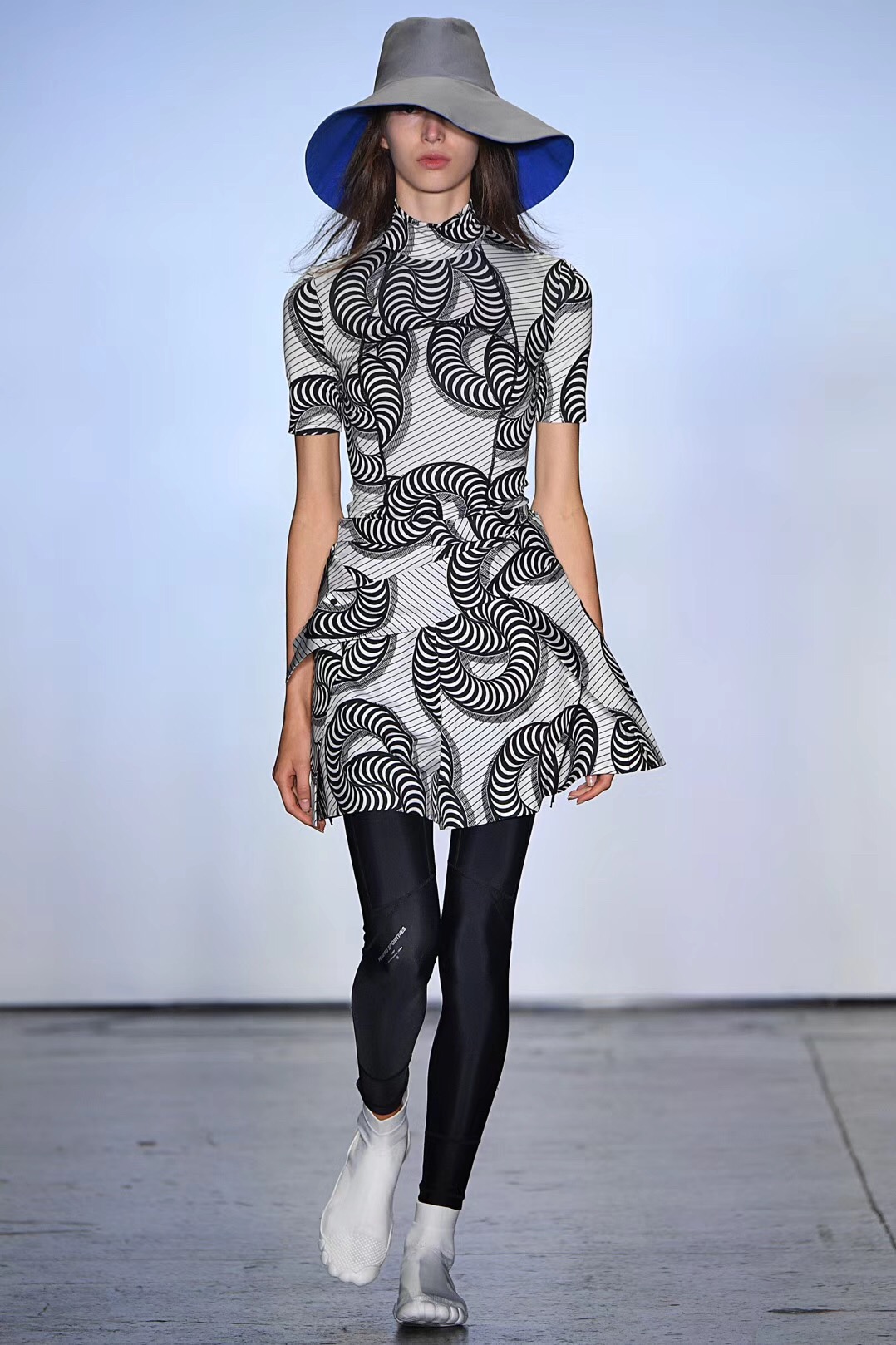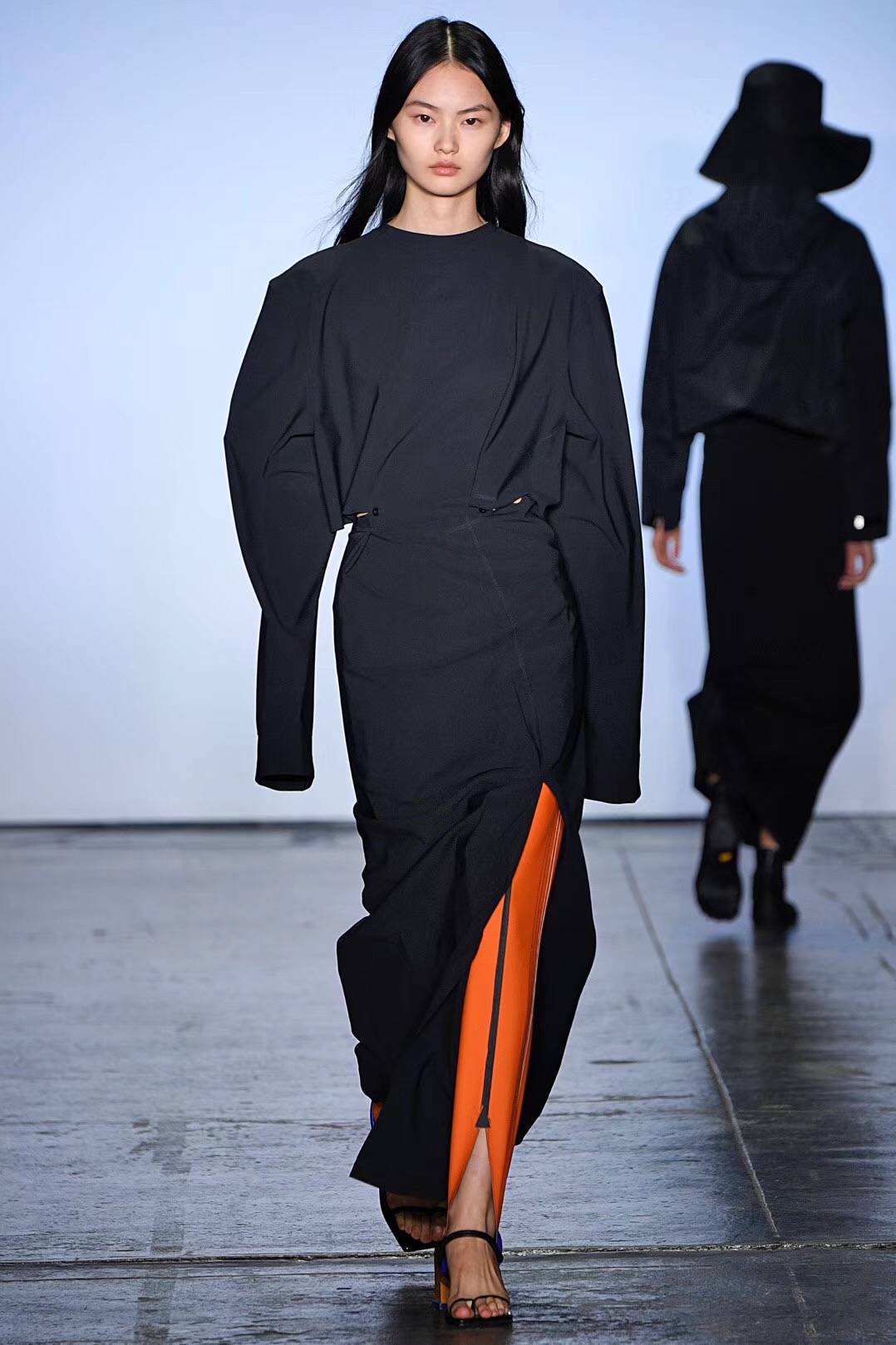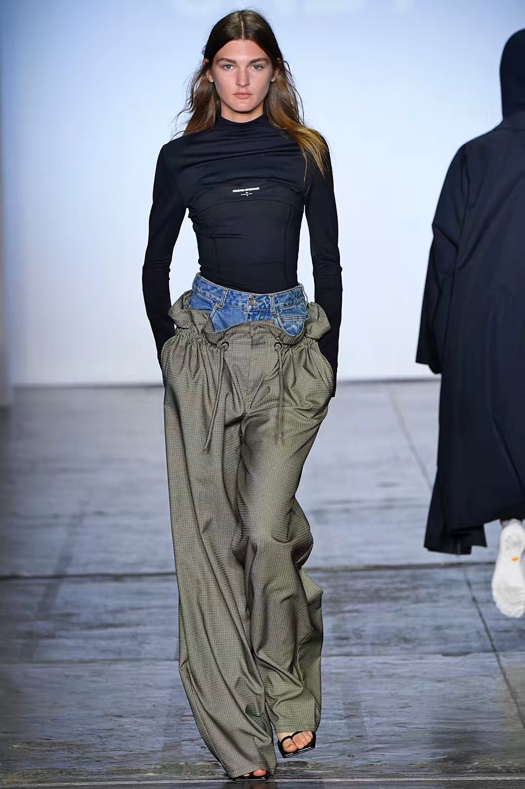 秀场上的运动器械不少都是划船机、蹦床等小众器材,Particle Fever纽约时装周上展示的最新系列也大多与小众运动有关。无论是为翼装飞行运动员设计的翼装、为搏击运动员设计的多功能腰带、还是为越野跑选手设计的贴身运动服,Particle Fever的最新系列都聚焦于服装的功能性和舒适性,因此都采用了超轻、贴身的高科技面料。秀上还出现了两个跨界合作的特别单品,一个是与3M公司合作、填充了最新保暖材料的多边形翼装棉服,一个是与深圳万象天地合作、印有大象图案的拳击腰带。