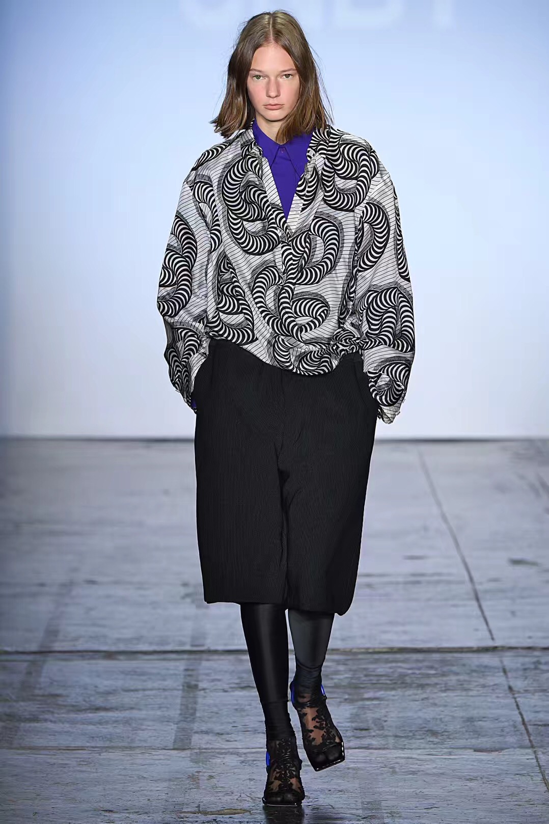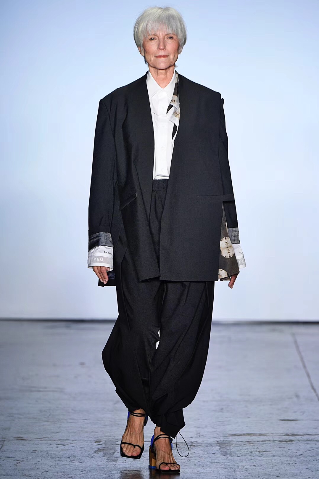 引起JNBY秀场小小轰动的最后登场的一位老年模特Maye Musk。她留着银白色的波波头,淡淡微笑着绕着秀场走了一圈,身穿黑色oversize西装和高跟凉鞋的她可能是很多人希望自己老去时的样子。
