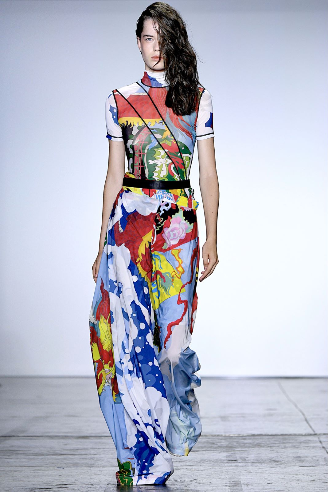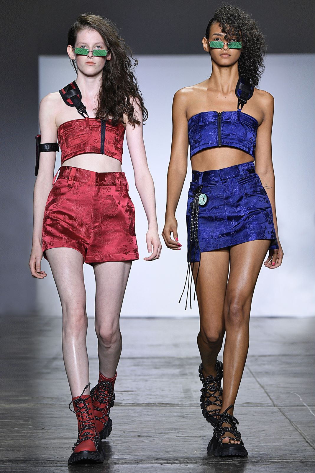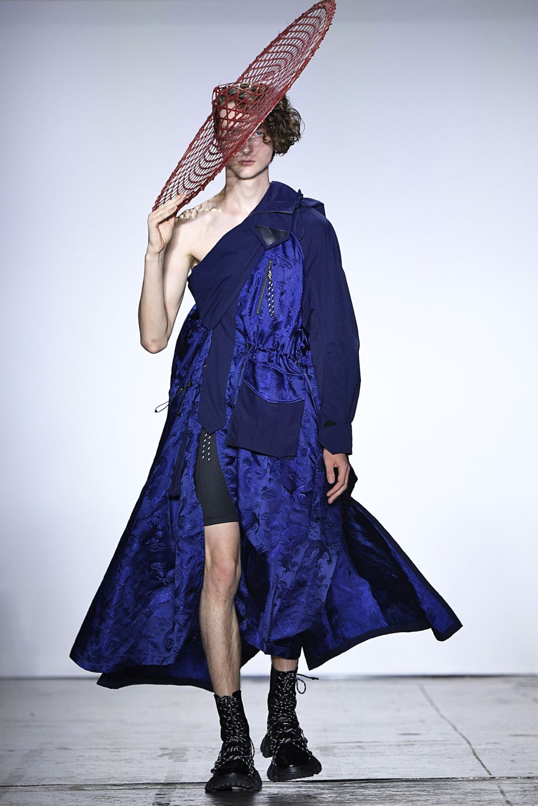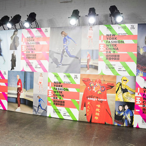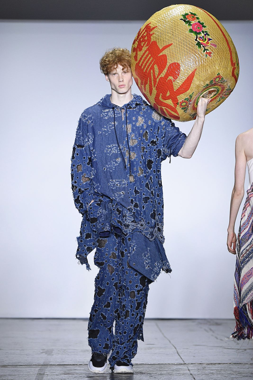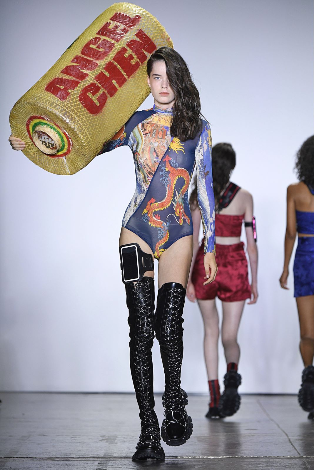 Angel Chen的秀场上,所有之前秀场上紧闭的窗帘都一一拉开,整个会场瞬时间变得明亮。不过登场的模特们不只是因为这样才显得亮眼,Angel Chen最新系列使用了超过20种材料,运用大量拼贴的荧光色,并且“龙”依旧是品牌最常见的标识之一,这些元素的叠加让身穿Angel Chen的模特们绝对能在人群中被一眼认出。除了材料和色彩的与众不同,几位展示最新系列服装的模特还配备着各种中国元素的小道具,例如写有Angel Chen名字并附着飞龙图案的灯笼,还有超大的圆形藤编帽子。