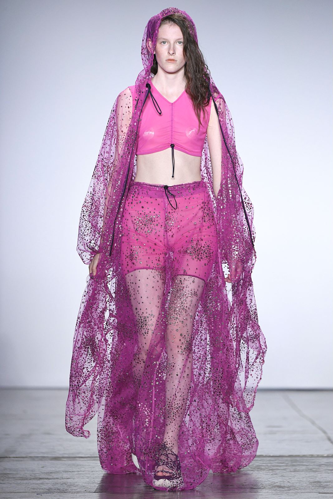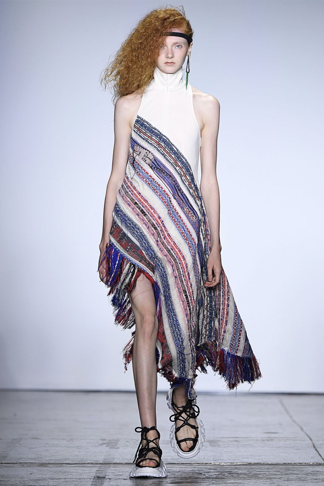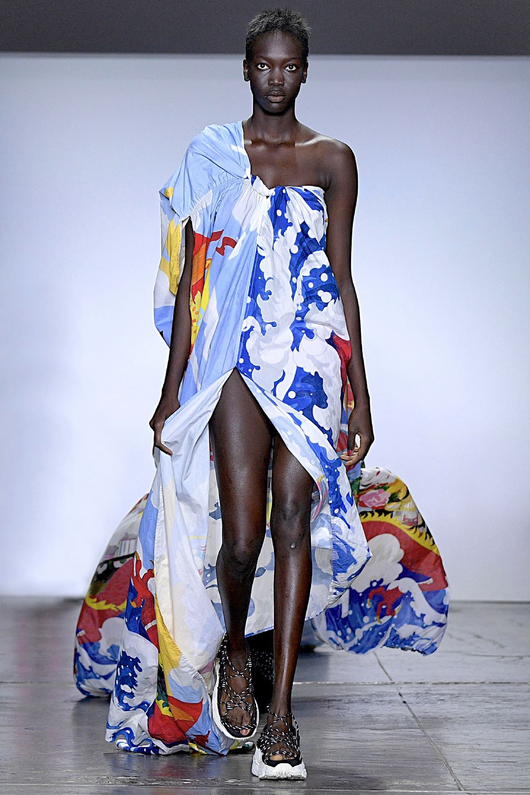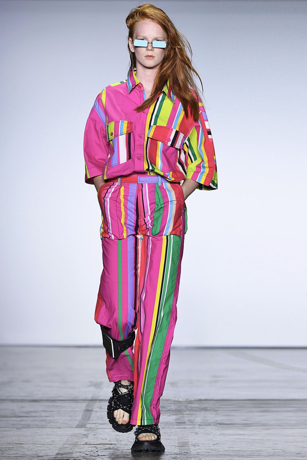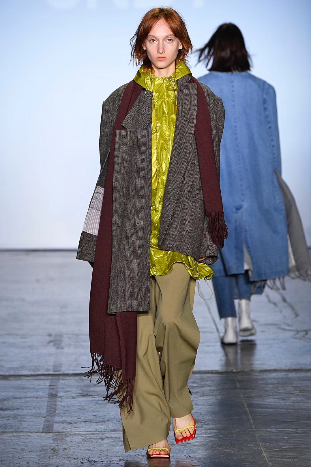 Angel Chen的秀场上,所有之前秀场上紧闭的窗帘都一一拉开,整个会场瞬时间变得明亮。不过登场的模特们不只是因为这样才显得亮眼,Angel Chen最新系列使用了超过20种材料,运用大量拼贴的荧光色,并且“龙”依旧是品牌最常见的标识之一,这些元素的叠加让身穿Angel Chen的模特们绝对能在人群中被一眼认出。除了材料和色彩的与众不同,几位展示最新系列服装的模特还配备着各种中国元素的小道具,例如写有Angel Chen名字并附着飞龙图案的灯笼,还有超大的圆形藤编帽子。