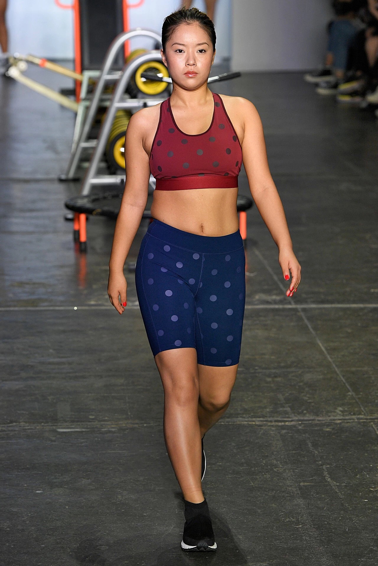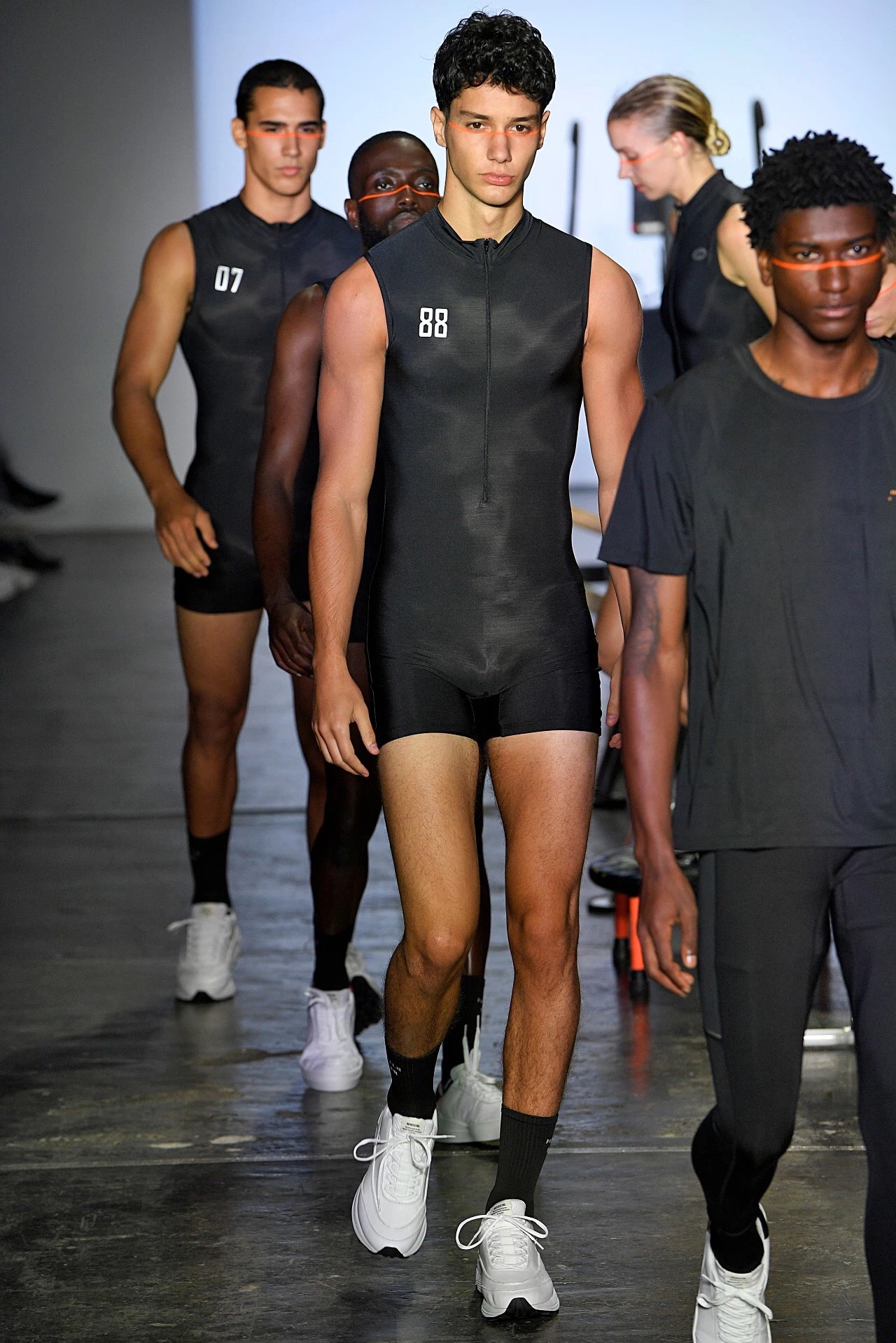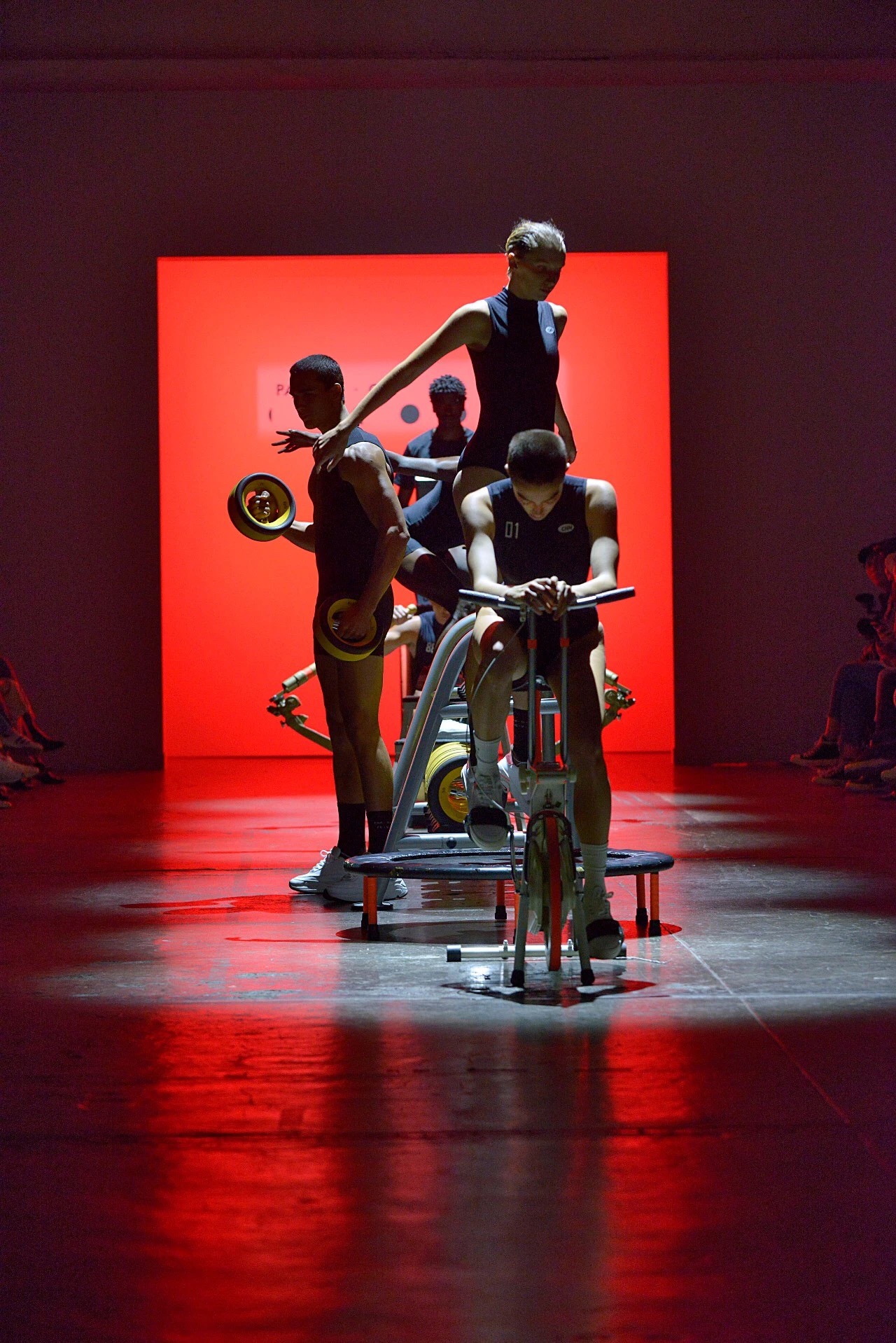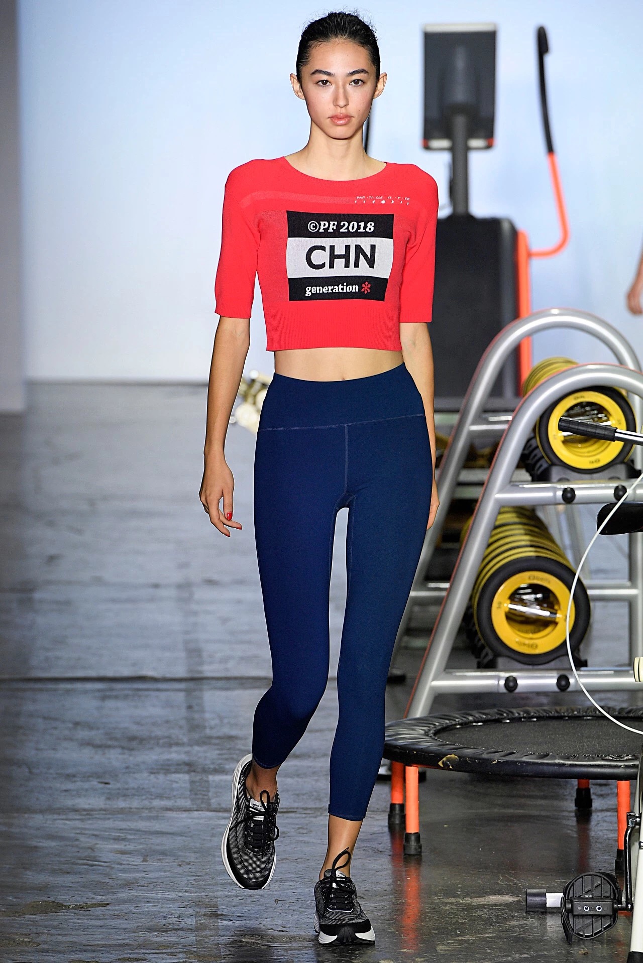 作为纽约时装周天猫中国日首秀品牌的Particle Fever,在场上收获最多的观众评价是“好玩”。火红的灯光、有节奏的鼓点和运动的喘息声开启了这场早在8点便开始的时装秀。身穿黑色训练服的模特先在秀场中央的六种运动器材上做了一会儿运动,随后才开始正式走秀。