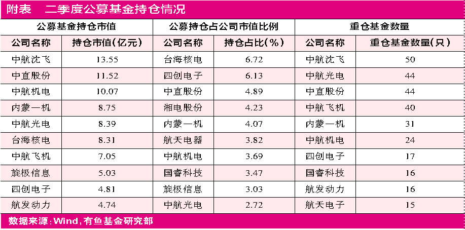 从重仓个股来看,持股市值排名靠前的标的为中航沈飞、中直股份、中航机电、内蒙一机等公司。由此可见,一些业绩具有确定性、估值水平比较低、流动性更强的个股更加受到公募基金的认可。例如二季度对军工行业增持较多的国投瑞银,旗下的国投瑞银国土安全、国投瑞银招财等基金的重仓股就集中在上述公司之中。