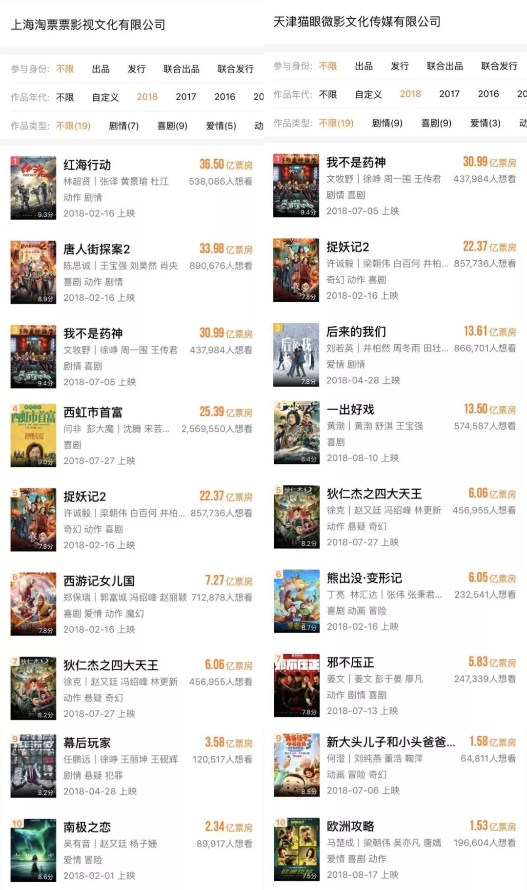 猫眼招股书显示,今年上半年在内容宣发上的投资一家超过了去年的1.26亿,达到了1.6亿,占全部投资金额比重的22.4%,并且还表示:“我们于2016年开始参与电影的主控发行并迅速成为中国排名第一的电影主控发行方。”而淘票票介入发行领域的时间虽短,但表现同样十分突出,根据淘票票专业版提供的数据显示,2017年淘票票参与了22部影片的发行工作,累计票房达到154亿,同样是民营公司中的佼佼者。