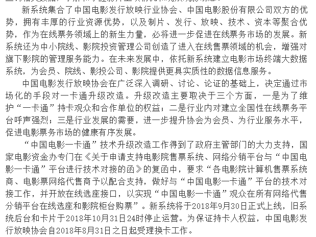 不过,所有这一切的前提都在于现有的竞争逻辑依然成立。毒眸发现,就在新政推出前后,此前由电影局、专资办、中影、华夏联合打造的“中国电影一卡通”系统,刚刚完成了项目技术改造升级,将变为“全国性的在线售票服务平台”,可“打通线上线下的通道,实现了在线充值、订片、选座、支付功能”。