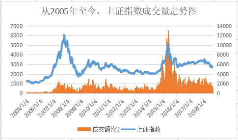下面就以上证指数从2005年至今,其成交量的走势图为例。