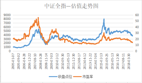 目前中证全指(000985)的估值水平已经接近历史底部区域了。