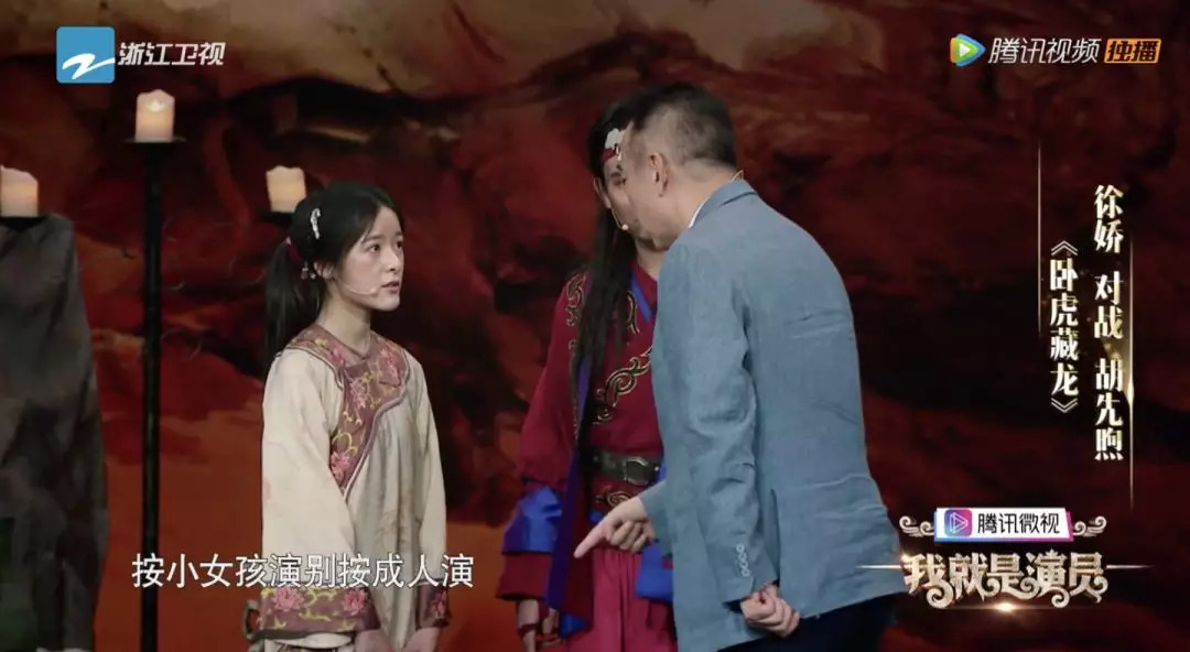 说到这已经很明白了,但这还没完。接着陈凯歌直接跑上了舞台现场导戏,向徐娇解释说明玉娇龙生长的环境会导致她恃宠而骄,建议她按着傲娇小女孩的样子演。胡先煦呢也别装深沉了,情窦初开的纯情小少年他演起来就很自然生动。
