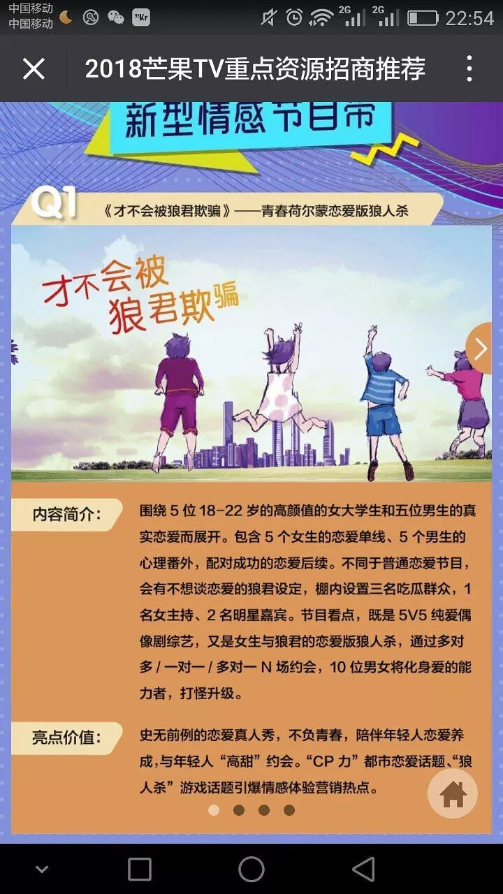 看起来恋爱节目的热潮还将持续一段时间。去年芒果TV在2018年招商会上提出了新型感情节目带的理念。宣布2018年将制作的综艺项目有《妻子的浪漫旅行》、《暧昧的朋友》、《才不会被狼君欺骗》……